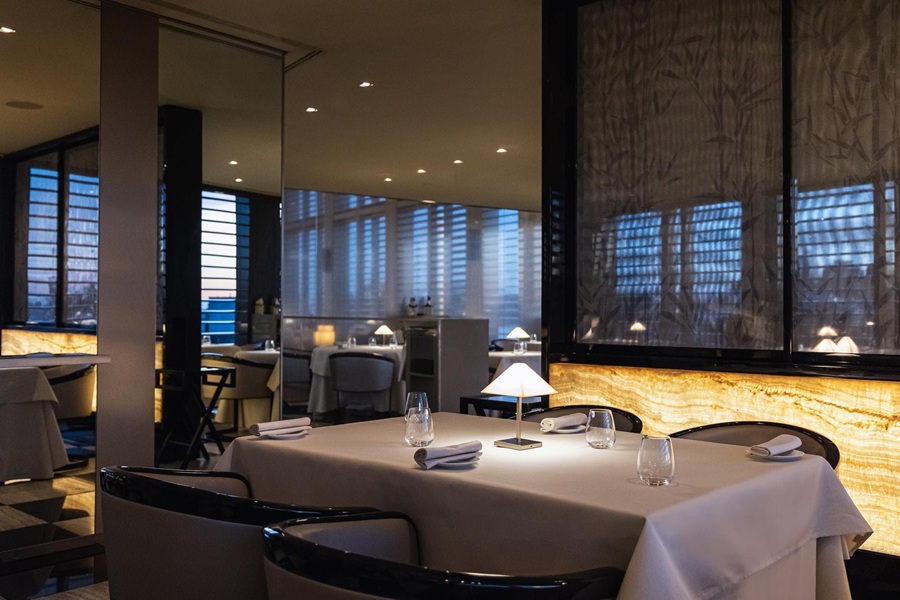 Il ristorante, infatti, sfrutta al massimo le sue ampie vetrate, rendendo la vista sullo skyline parte integrante dell’esperienza culinaria, soprattutto la sera.