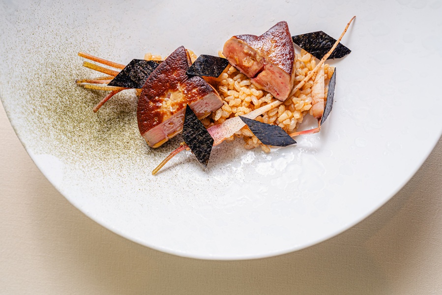 Si parte con due antipasti raffinati: le Capesante (appena scottate, accompagnate da crema di pane, rafano, anguilla affumicata e latticello) e il Foie Gras (d’oca, scottato, con tamari, riso, radici di prezzemolo e alga nori).