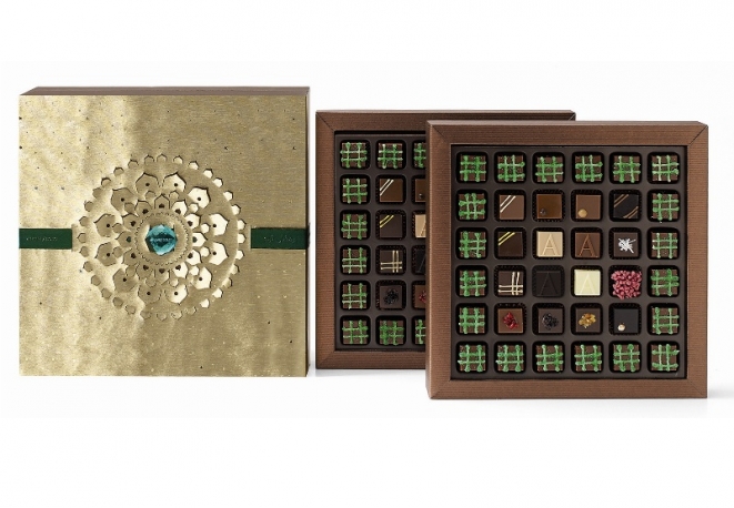 Oltre agli ingredienti, anche il packaging è un richiamo all’arte islamica. Dalla carta dorata dall’aspetto serico, intagliata per creare il disegno di un fiore di loto aperto che avvolge la pralina, alla scatola è avvolta da un nastro di seta e da una gemma verde smeraldo che spicca al centro.