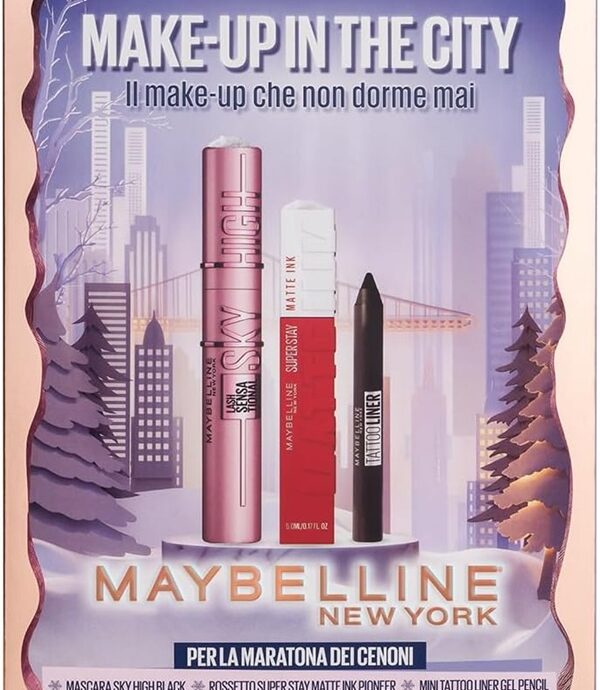 Racchiude tre prodotti base in una pochette, con tutto il necessario per creare un look completo per in ogni occasione. Il trio Maybelline comprende il mascara Sky High Black, la mini Tattoo Liner Gel Pencil, il rossetto SuperStay Matte Ink Pioneer. Ideali per cene e momenti in cui il make-up deve durare a lungo.