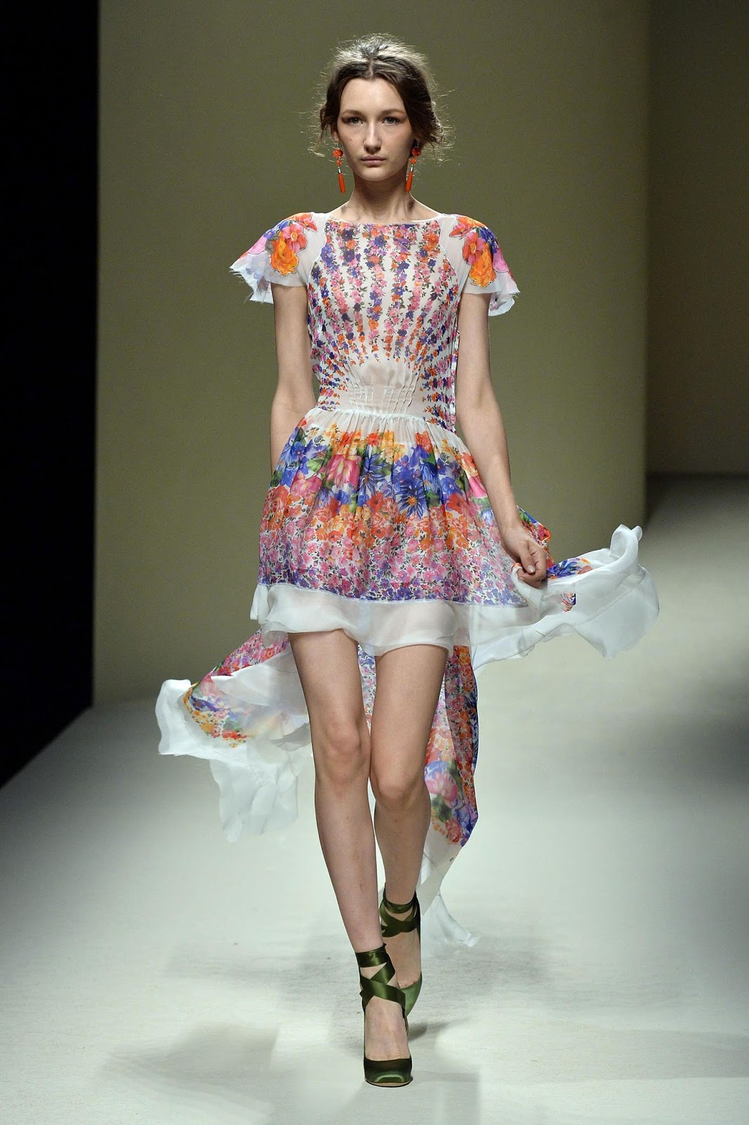 Alberta Ferretti ha presentato una donna allegra, solare, una moderna Frida Kahlo, o comunque una donna d’ispirazione sudamericana, che indossa splendide creazioni che ispirano buonumore solo a guardarle. Abiti in cotone bianco, rosso o nero con fiori colorati, che vanno a decorare il corpino, il collo, o il girovita, completini con gonne dalle lunghezze variabili, o molto lunghe o decisamente sopra il ginocchio, top o camicette spesso trasparenti e tagliate sopra la vita. I colori sono sempre presenti, anche quando si spostano dai decori floreali alle stampe. Nella parte finale un po’ di monocolore, compare il verde, l’arancio ed il fucsia sempre su abiti dal taglio romantico. Ed ai piedi ballerine di raso con fiori applicati e nastri.