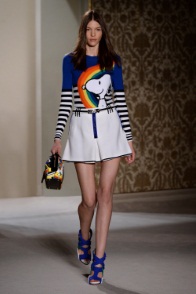 Fay per il primo anno opta per una sfilata invece della solita presentazione e lo fa proponendo una collezione deliziosa, adatta alle più giovani, ma non solo, con protagonista l’amato Snoopy, il bracchetto filosofo e anticonformista dei Peanuts. Tommaso Aquilano e Roberto Rimondi, che hanno firmato questa collezione, lo ripropongono su abiti, gonne, camicette, con colori esplosivi e contrastanti che vanno dal blu elettrico al verde squillante, dal rosso al giallo, dal bianco e al nero, ed in diverse dimensioni. Allegro ed irriverente appare sia sulle gonnelline corte e rigide in cotone effetto neoprene, sia sui capi sportivi in primis sulla felpa, che diventa un capo alla moda, sia piumini lucidi e sciccosi in bianco o in nero. Non manca neppure sui bauletti portati a mano o sui sandali-sneakers.