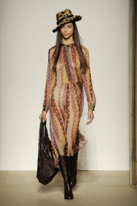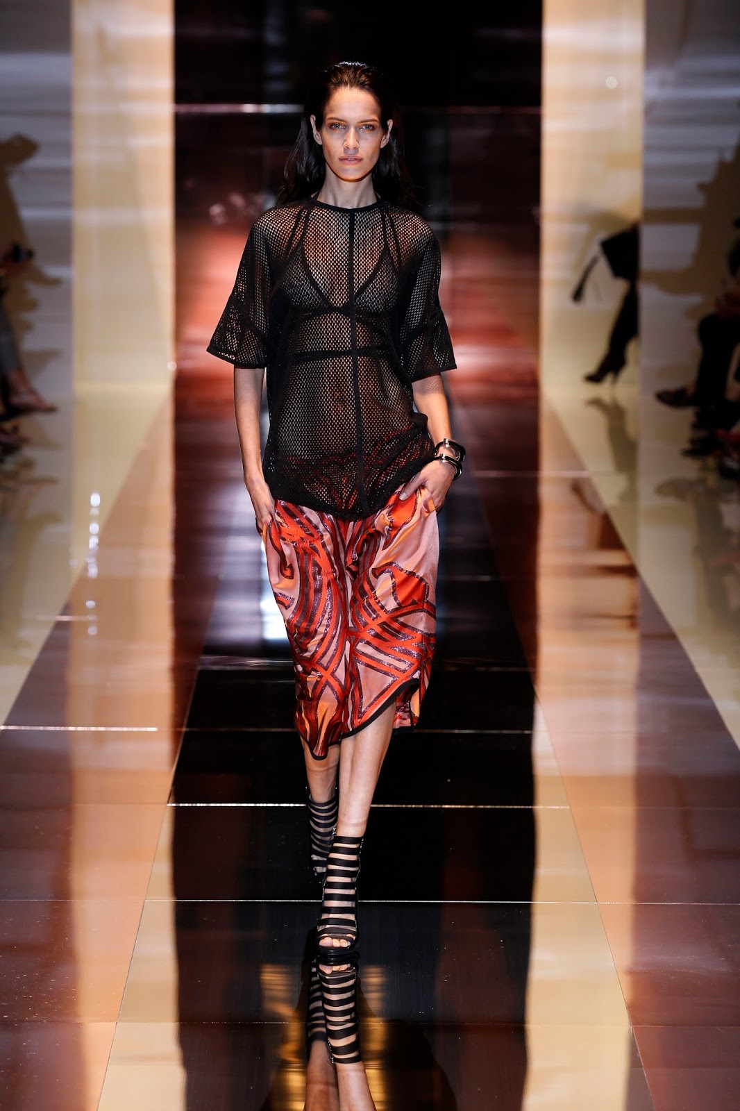 Attesissima la sfilata di Gucci, per vedere se lo stile di Frida Giannini fosse cambiato con la maternità, e la stilista non ha deluso neppure uno dei suoi più accaniti fans. Sulla passerella sfila, anche in questo caso, una collezione fresca, ma qui si punta più sulla sensualità che sul romanticismo, con richiami al mondo sportivo. Frida lo usa per i dettagli tecnici, nelle bordature nere quasi da competizione, nei reggiseni da atleta con bretelle incrociate che sbucano dalle scollature davanti e dietro, nella rete tecnica che vela tagli e trasparenze, negli abiti t-shirt e nelle tute da sera tagliate come gym pants. La stilista è partita da alcuni capi del guardaroba sportivo per arrivare ad abiti sensuali dai colori caldi come ruggine, ciliegia, ocra, verde che finiscono sempre nel nero, illuminato da lurex, con motivi in lamé oro e rame e ricami in paillettes secondo un sofisticato decorativismo che ricalca i disegni art nouveau. Le calzature sono molto alte, quasi un sandalo con tacco a cono e bande elastiche parallele che salgono a stivaletto sulla caviglia scoperta, mentre le nuove borse sono arricchite con frange o sono grandi clutch, semplici shopper, piccole tracolle, tutte però accomunate dal manico in bambù bruciato, quasi nero.