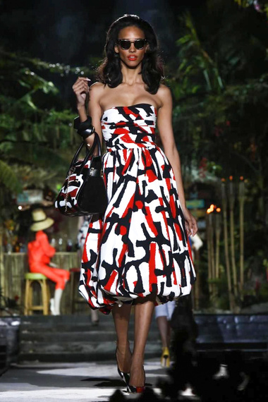 I terribili gemelli Dean e Dan Caten, dopo avervi stupito anche con collezioni provocatorie, subiscono il fascino degli anni ’50 e, ispirandosi a Esther Williams o ad una moderna Marilyn Monroe, presentano una bellissima collezione dalle forme sexy firmata DSquared2. Ecco quindi sfilare divertenti microshorts portati con giacchine dai ricami floreali, completate da maxi collane con pietre colorate, foglie d’oro e grappoli di corallo e sandali con il tacco in legno e costumi da bagno, imbottiti sui fianchi per enfatizzare la forma a clessidra. Per il cocktail invece le proposte sono abiti con balze di pizzo di pelle tagliata al laser, completi di cavallino a stampa zebra e gonne sotto il ginocchio con strati di tulle che danno un effetto a campana, sottolineando la vita sottile. Completano il look, cappelli a paralume in rafia e seducenti occhiali da gatto, da portare anche di sera.